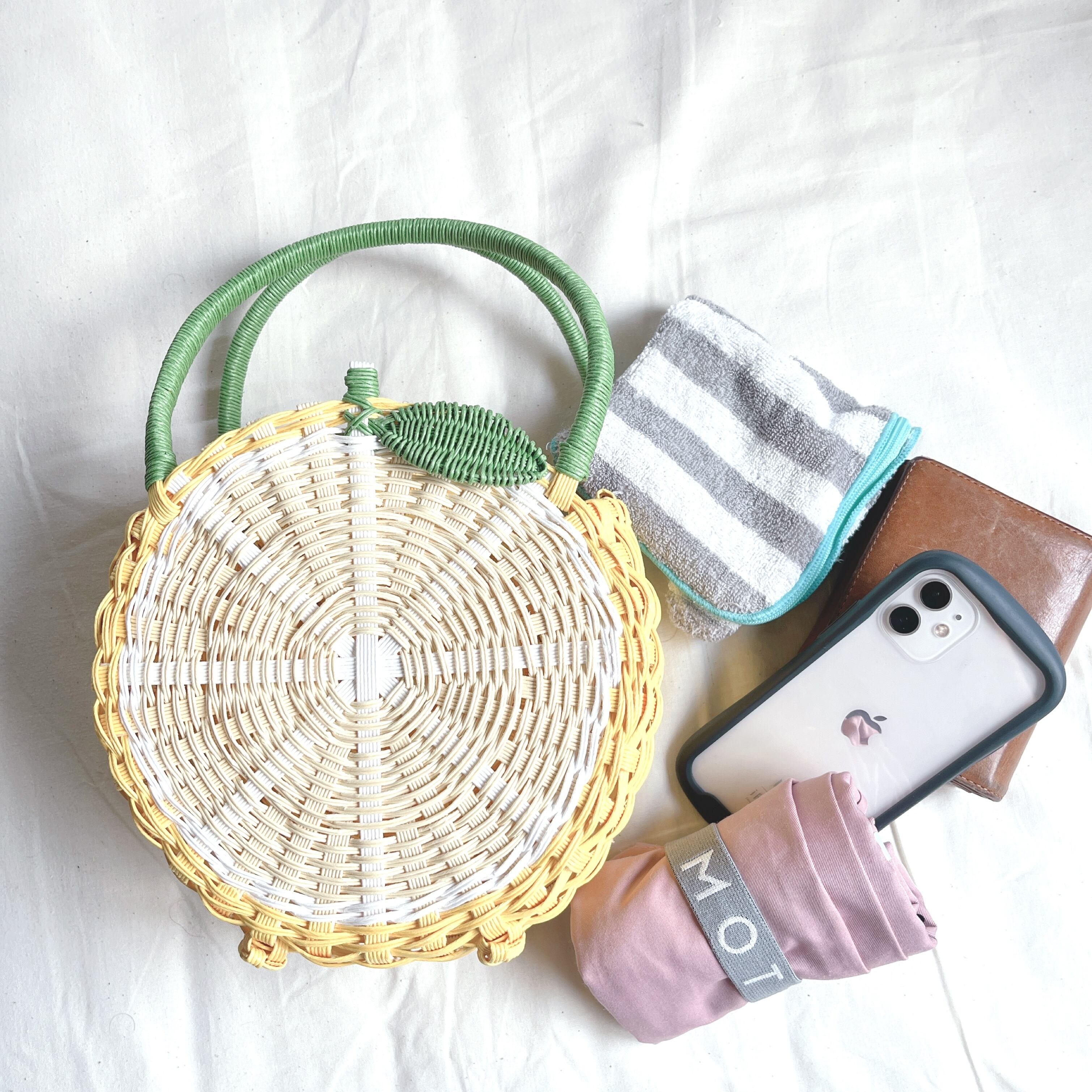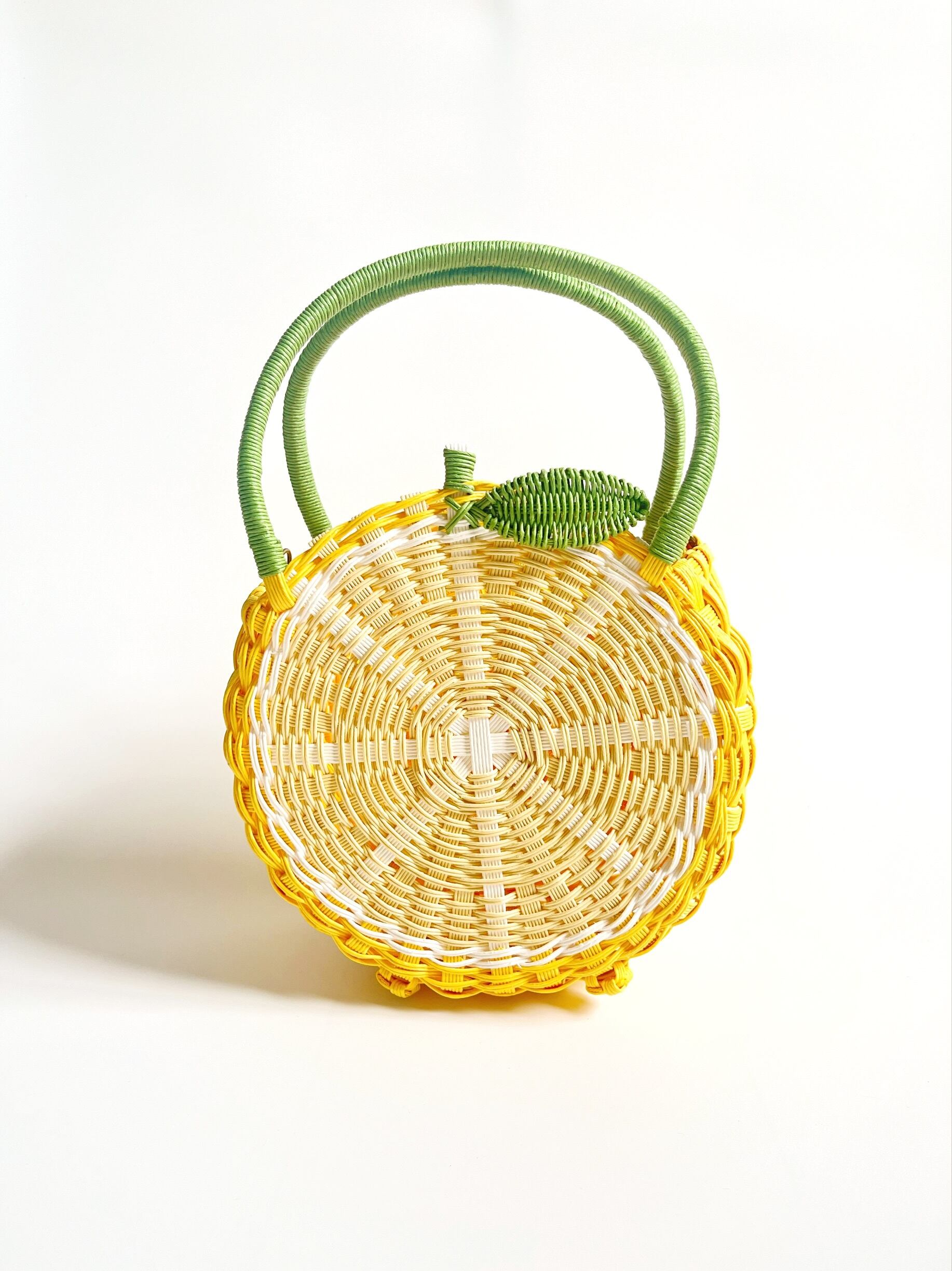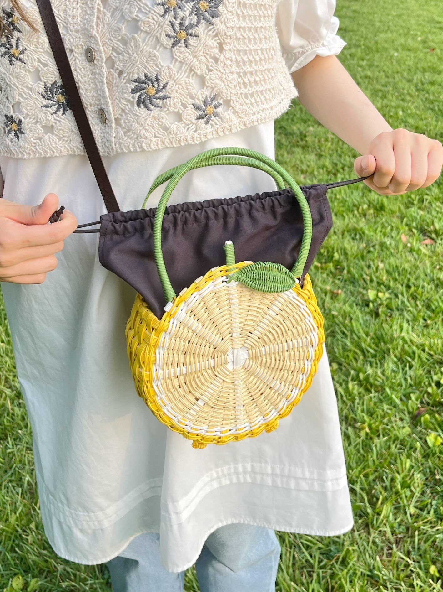 手芸用の紙バンドでまあるく編み上げた、レモンの形のカゴバッグです。